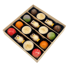 Descubra nuestra caja de pralinés de chocolate de otoño, 16 bombones belgas hechos a mano en una elegante caja de regalo artesanal. Perfecto para regalar esta temporada o darse un capricho.