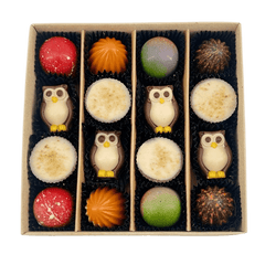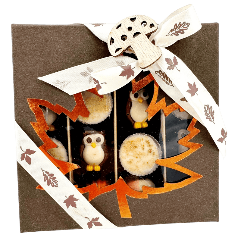 Descubra nuestra caja de pralinés de chocolate de otoño, 16 bombones belgas artesanales en una elegante caja de regalo marrón oscuro. Perfecto para regalar esta temporada o darse un capricho.
