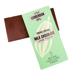 Chocolate con leche Camerún Lembé Yézoum 44%, una exclusiva tableta de origen único elaborada artesanalmente en Bruselas. Una creación de 100 g con notas refinadas y un terruño excepcional.