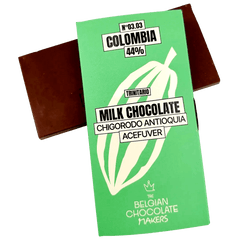 Colombia Chigorodó Antioquia Acefuver 44% chocolate con leche, elaborado artesanalmente en Bruselas a partir de cacao de origen único. Una tableta suave con delicadas notas afrutadas y de caramelo.