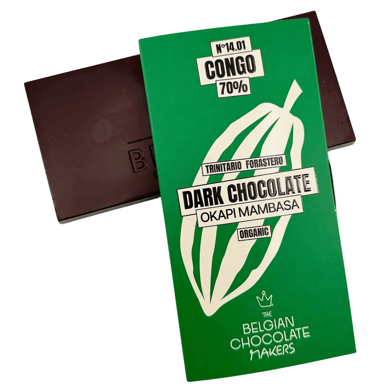 Disfrute de nuestro chocolate negro al 70% procedente de Okapi, Mambasa, en el Congo, obtenido éticamente de agricultores locales.
