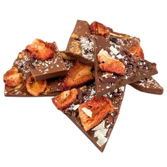 Barritas rotas de chocolate con leche con coco, fresa y cacao nibs