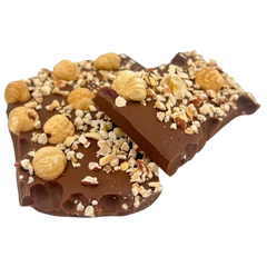Barritas artesanas de chocolate con leche partido con avellana. Elaboradas con cacao fino de Haití, ofrecen una delicia gourmet suave, afrutada y con sabor a nuez.