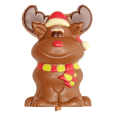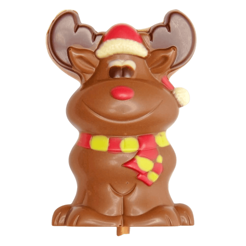 Simpática y deliciosa piruleta de reno navideño de chocolate con leche, hecha a mano en Bruselas con chocolate belga de primera calidad. Un capricho festivo para los niños y los amantes del chocolate