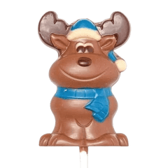 Adorable piruleta de reno de invierno de chocolate con leche, elaborada artesanalmente en Bruselas con chocolate belga de primera calidad. Un capricho dulce y festivo para la temporada de invierno.