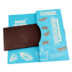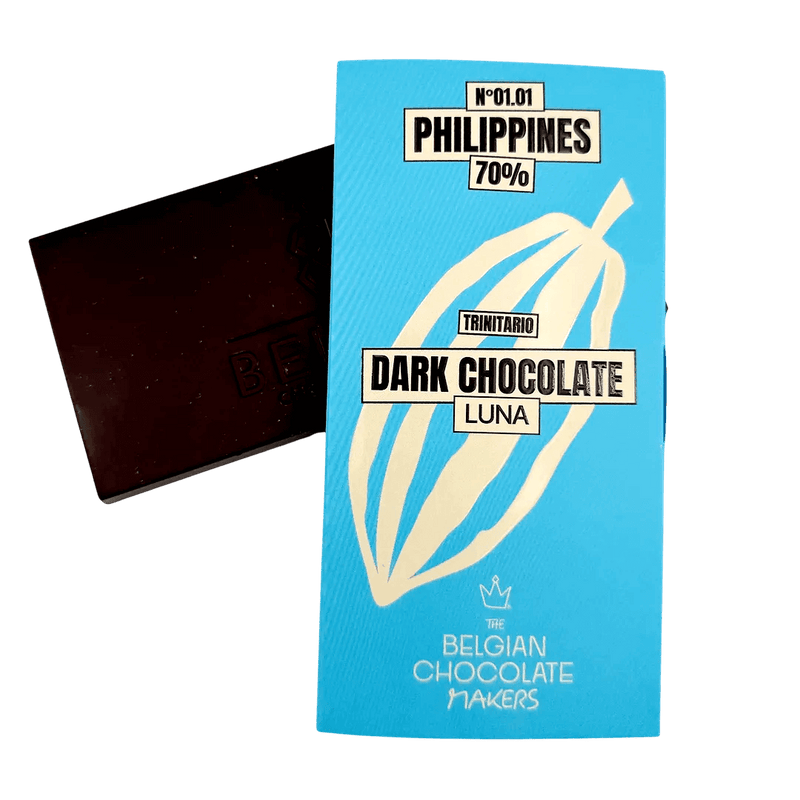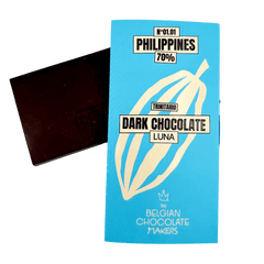 Chocolate negro Philippines Luna 70%, una creación exclusiva de origen único elaborada artesanalmente en Bruselas. Cacao raro con elegantes notas tropicales y refinada profundidad.