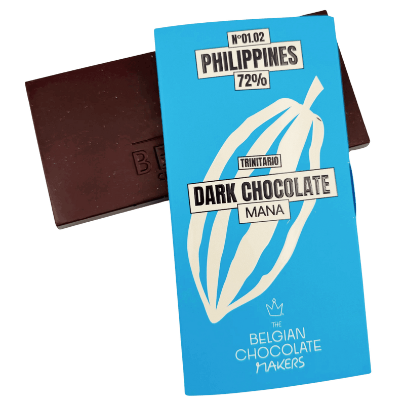 Filipinas Mana 72% chocolate negro, una exclusiva barra de origen único elaborada artesanalmente en Bruselas. Cacao poco común con refinadas notas tropicales para una experiencia de degustación realmente elegante.